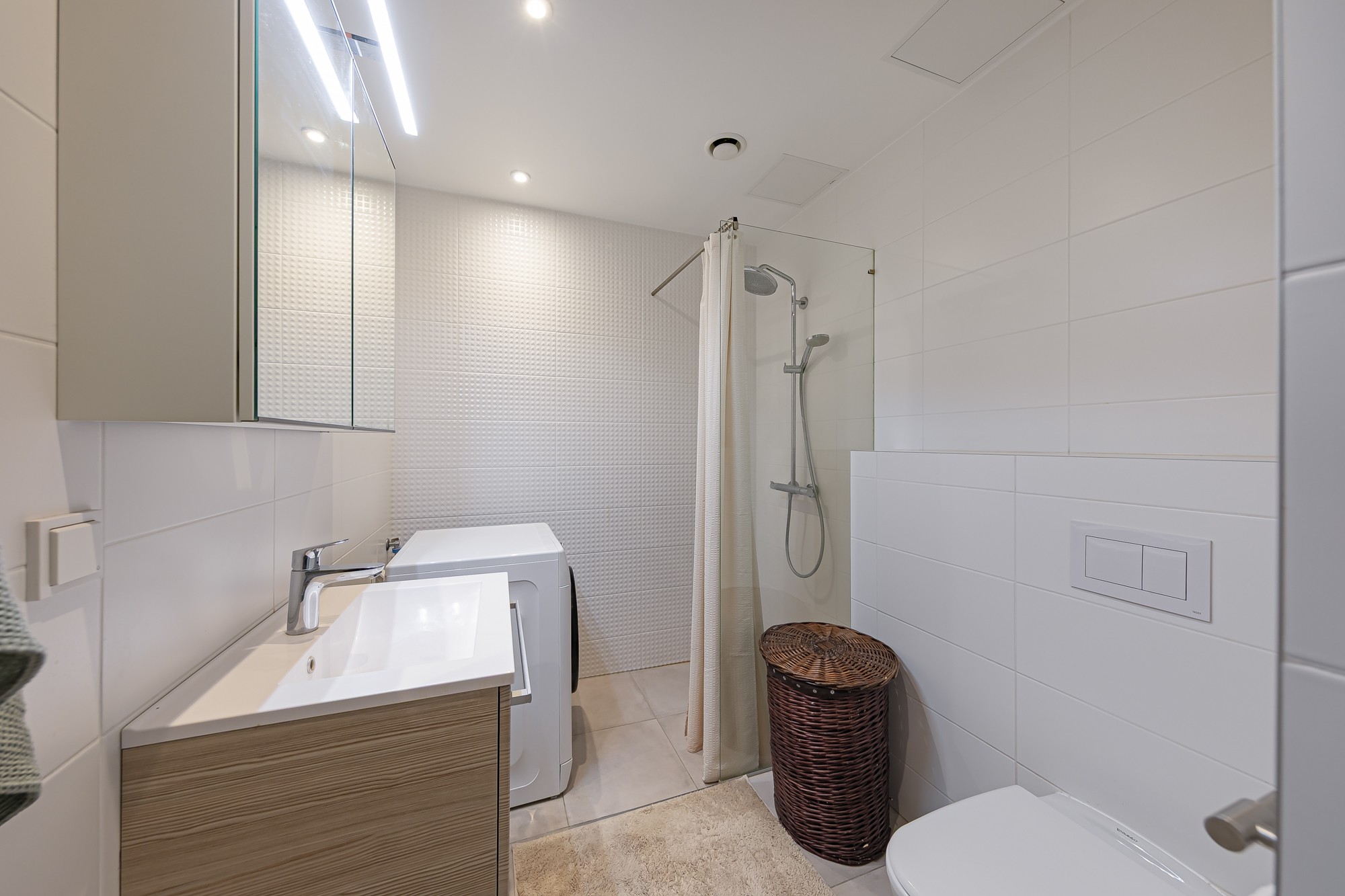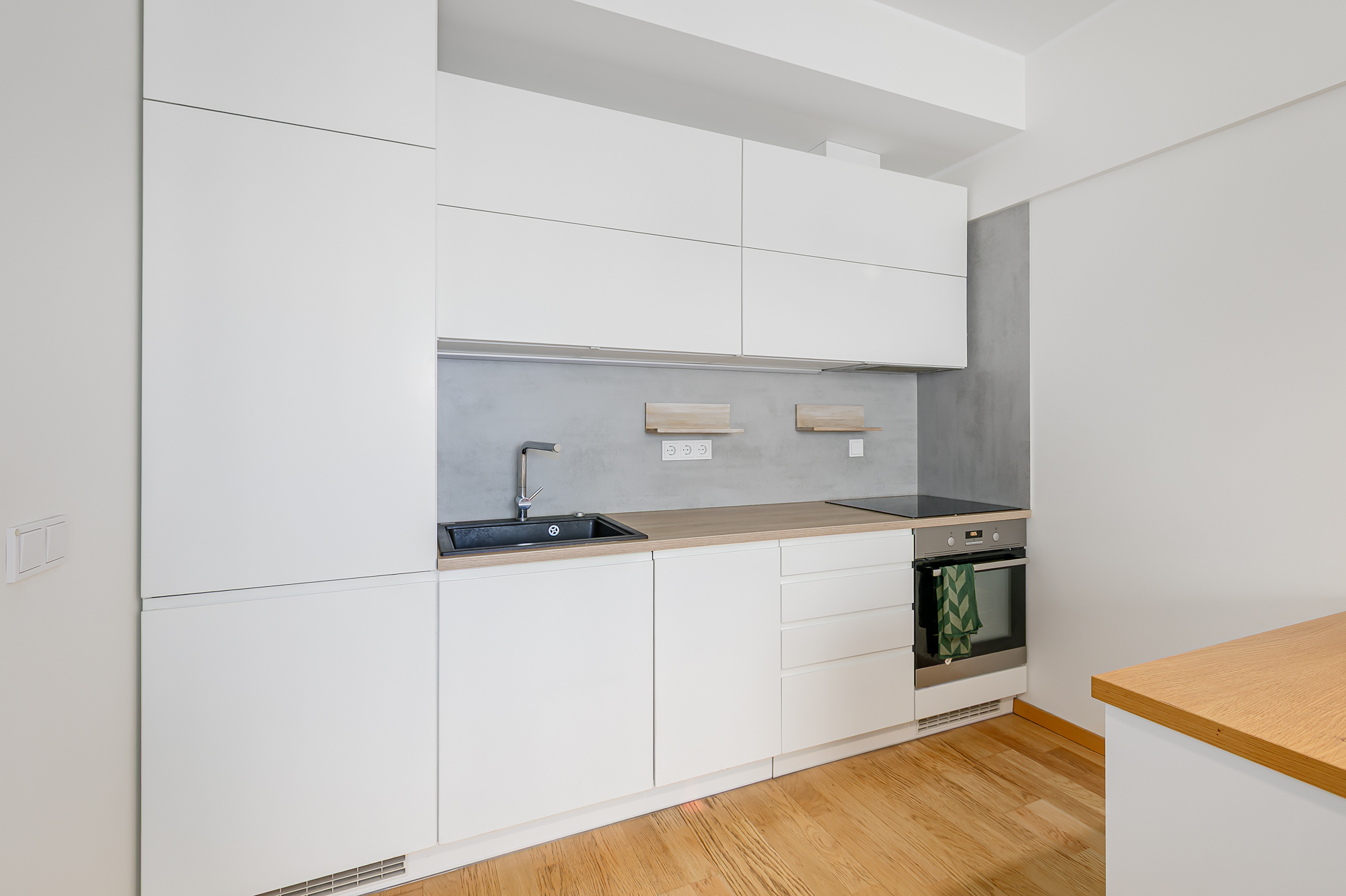 Kvaliteetsesse ja funktsionaalsesse köögimööblisse on integreeritud ajatu disainiga masinad: pliit, toiduahi, õhupuhasti ja külmkapp koos sügavkülmikuga.Magamistoas on sisseehitatud lükandustega kapp. Duširuumis on pesumasin.