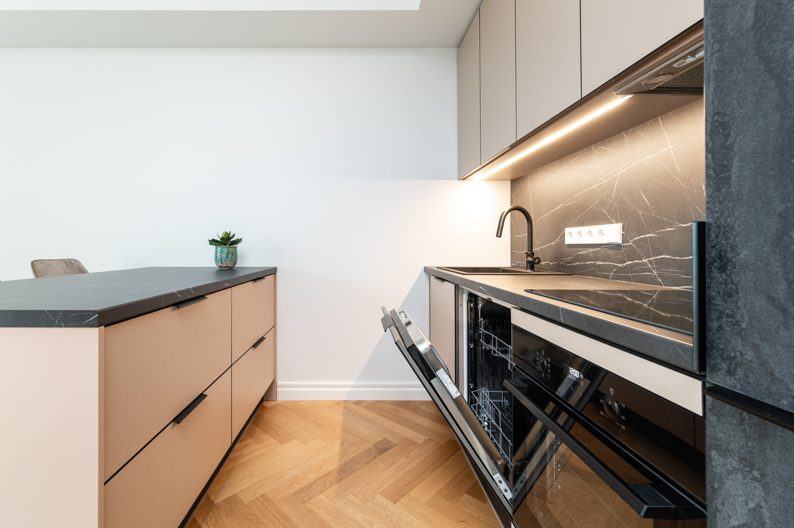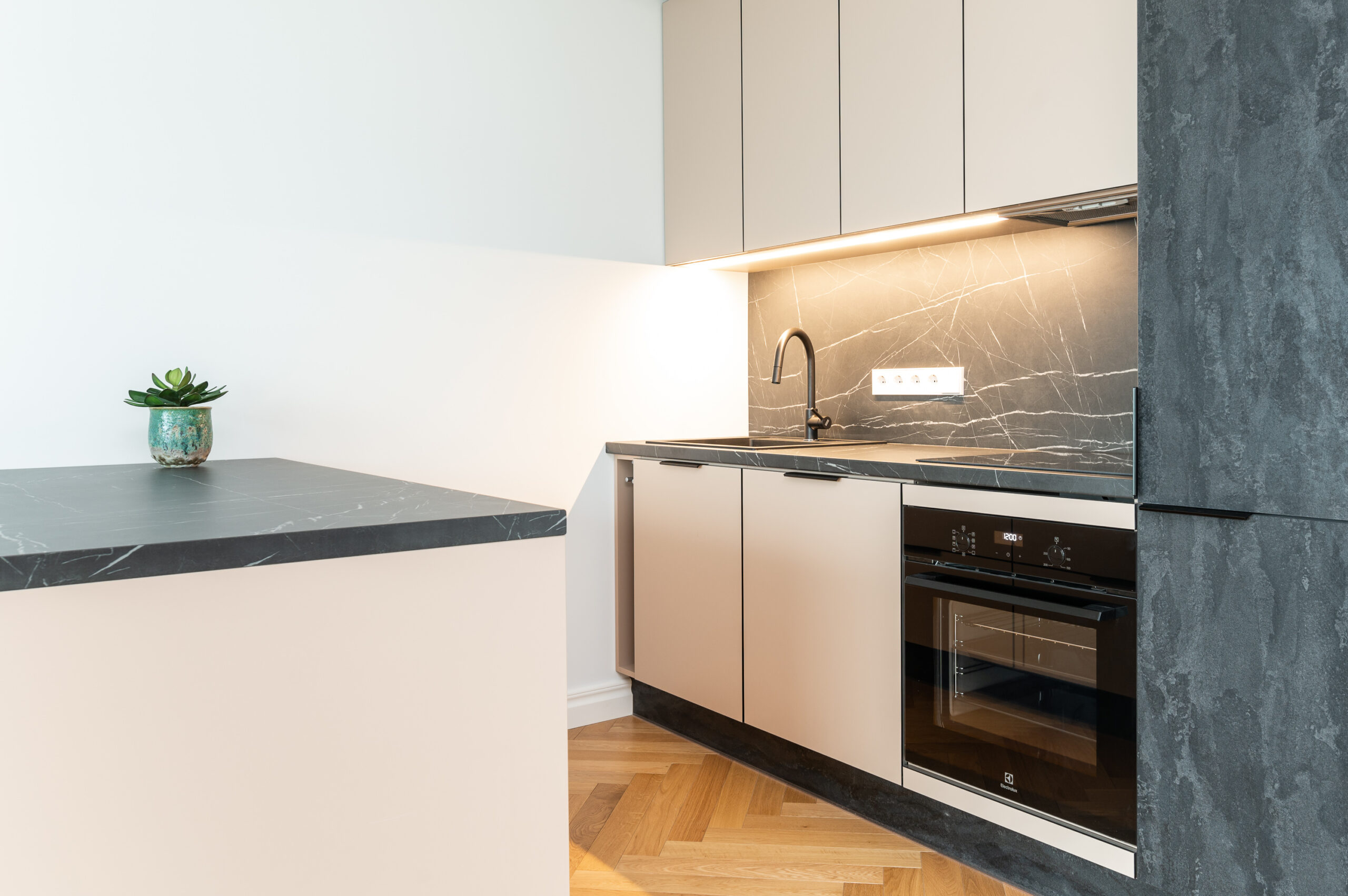 Funktsionaalsesse köögimööblisse on integreeritud kvaliteetne Electrolux köögitehnika (nõudepesumasin, induktsioonpliit, toiduahi, mikrolaineahi, õhupuhasti, külmkapp koos sügavkülmikuga).
