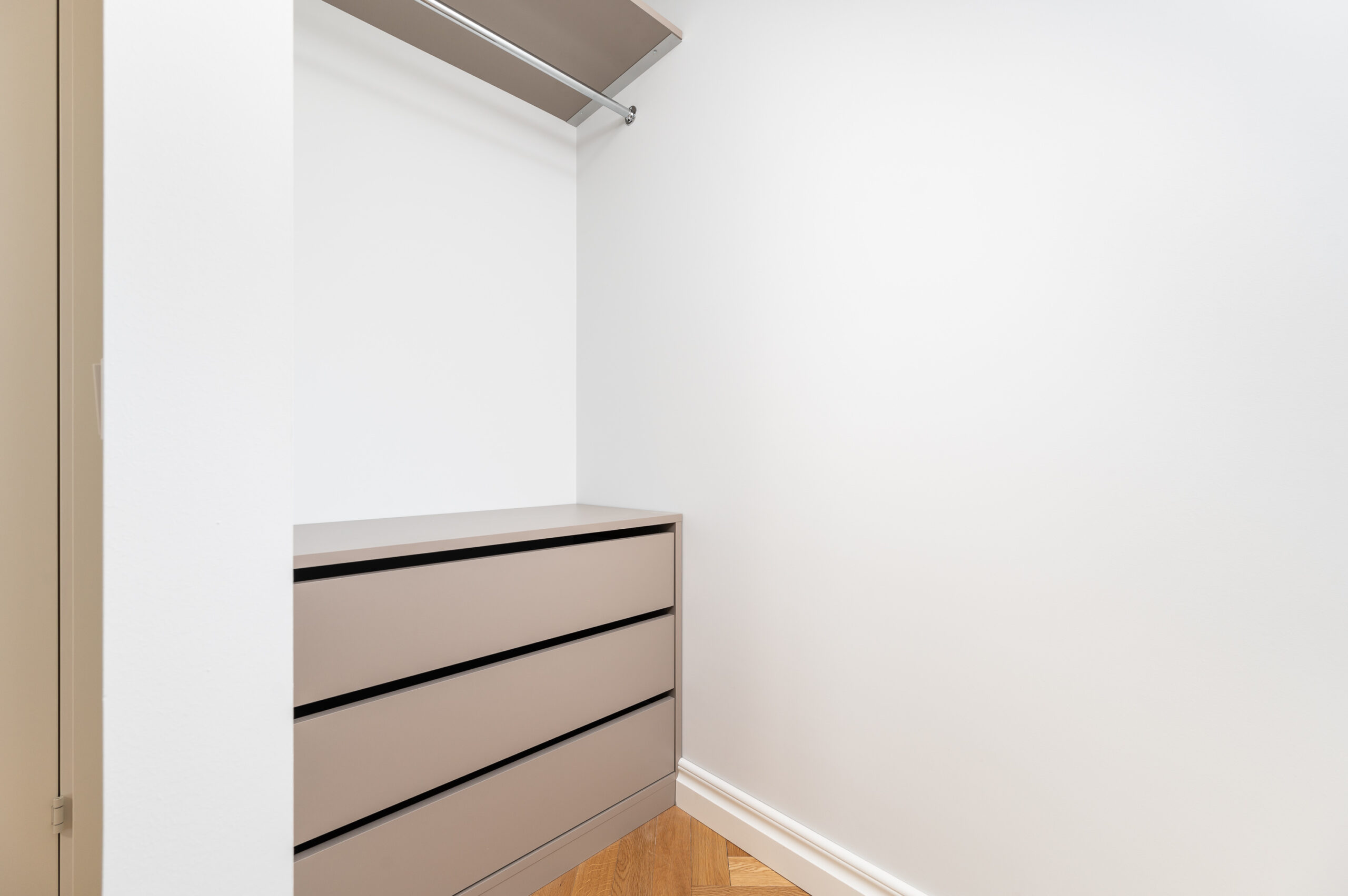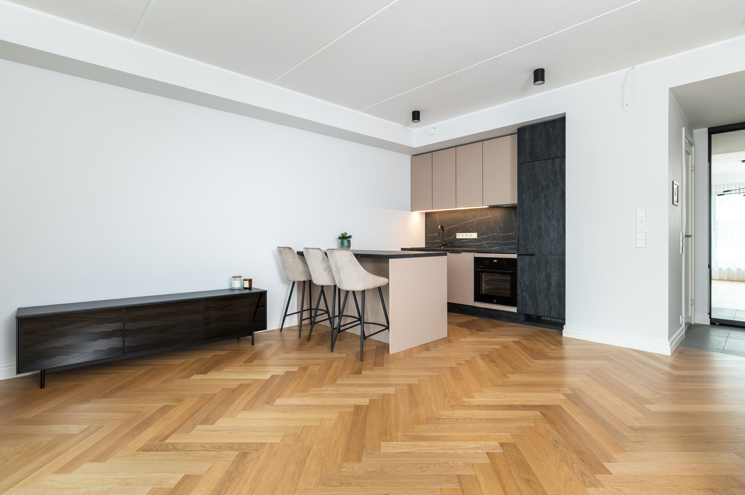 Korteri põrandaid katab paeluva kalasabamustriga ja naturaalse tooniga tammeparkett, millele lisavad tekstuuri peenelt faasitud ääred. Mahuka garderoobiga esiku põrand on plaaditud.