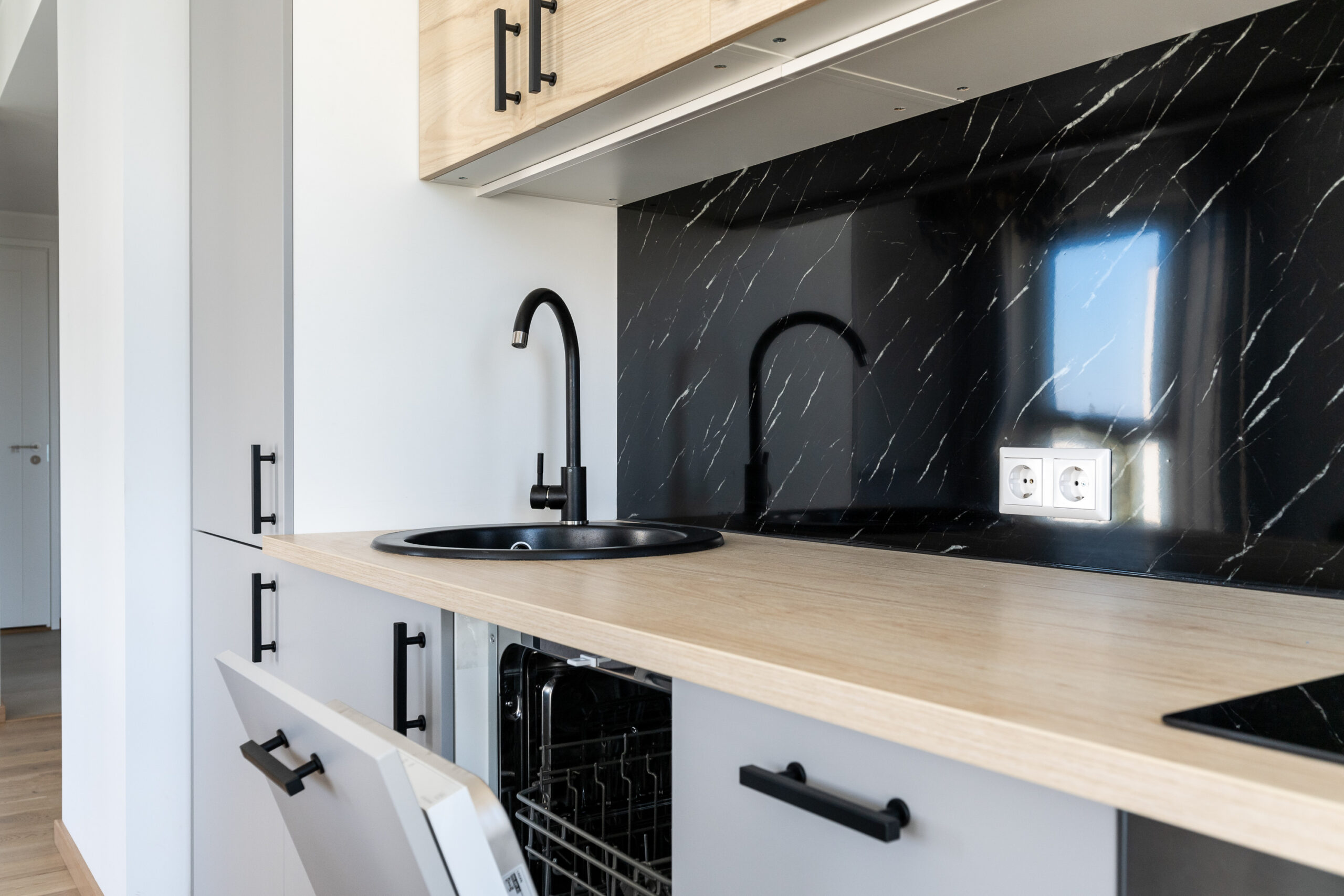 Köögis on kvaliteetne köögimööbel ja -tehnika: induktsioonpliit, ahi, kubu, külmkapp koos sügavkülmikuga ja nõudepesumasin.
