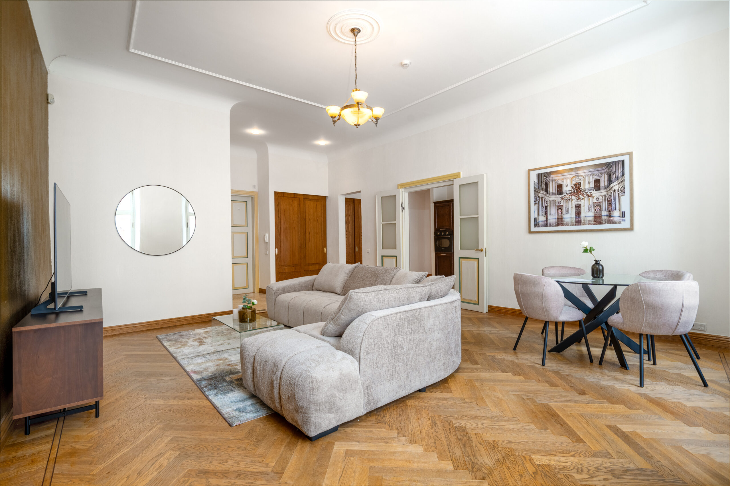 Korter on avatud planeeringuga ning kõrgete lagedega, lisades avarust ja ruumi. Interjöör võtab arvesse korteri erilist asukohta ja positsiooni, ühendades kvaliteedi ja hea maitse. Siseviimistluses on kasutatud naturaalseid toone.