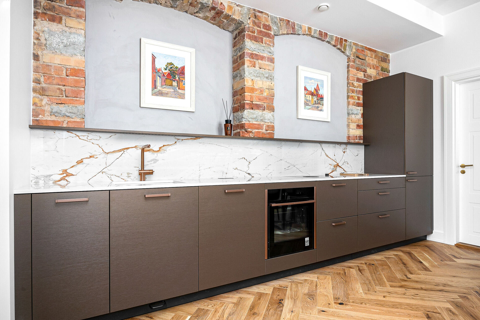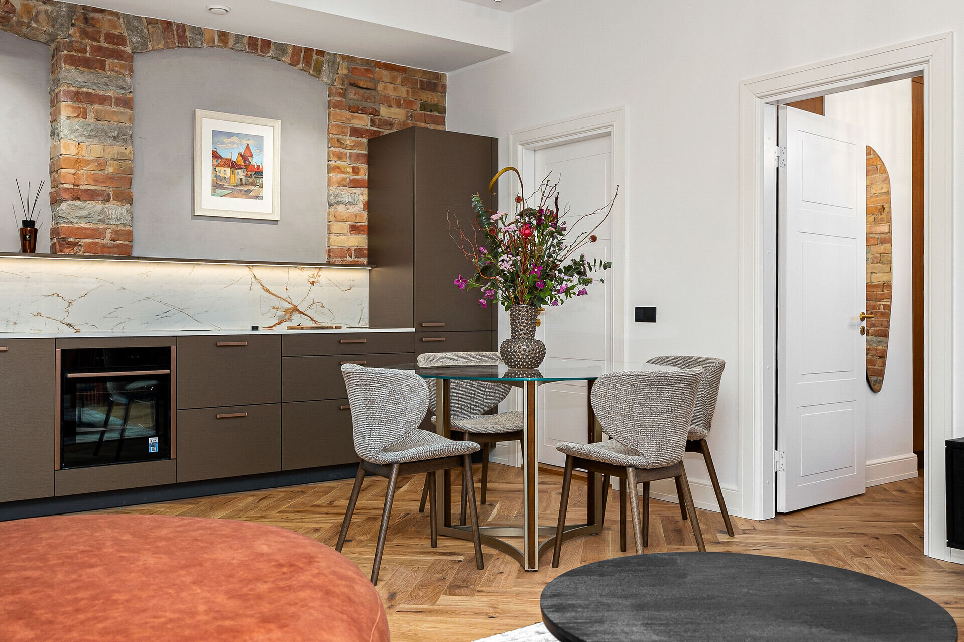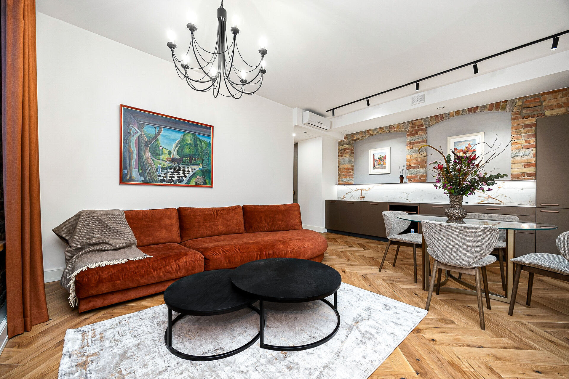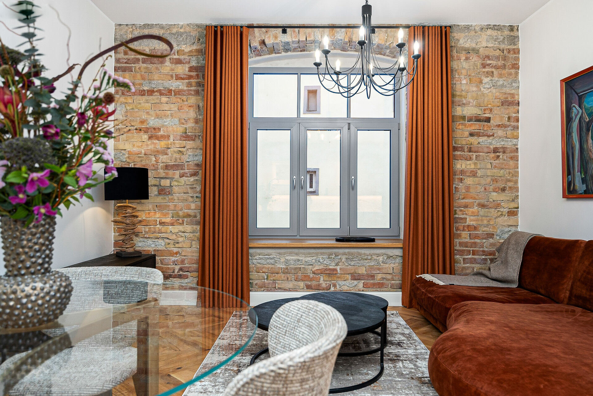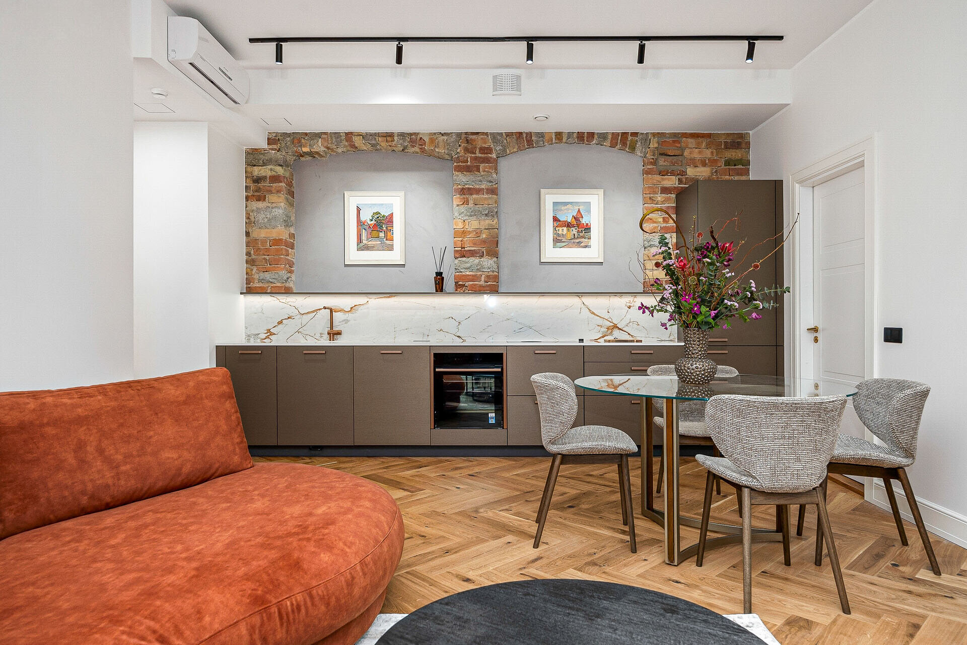 Naturaalsed toonid loovad rahuliku ja hubase atmosfääri, mida täiendavad algupärased punastest tellistest aktsentseinad, lisades ruumile iseloomu ja industriaalset elegantsi.