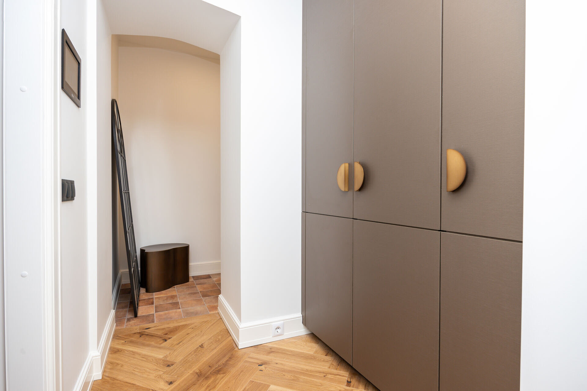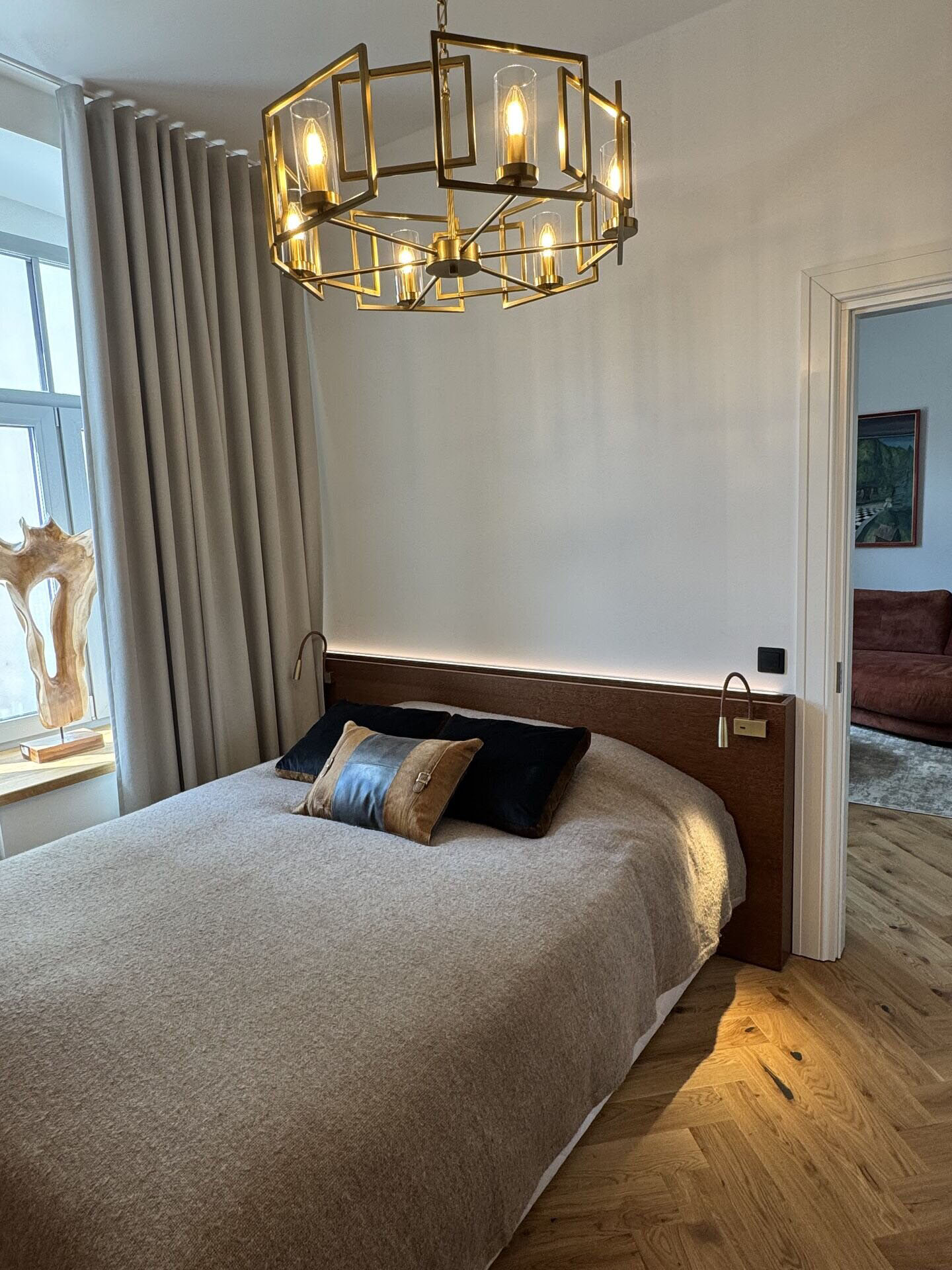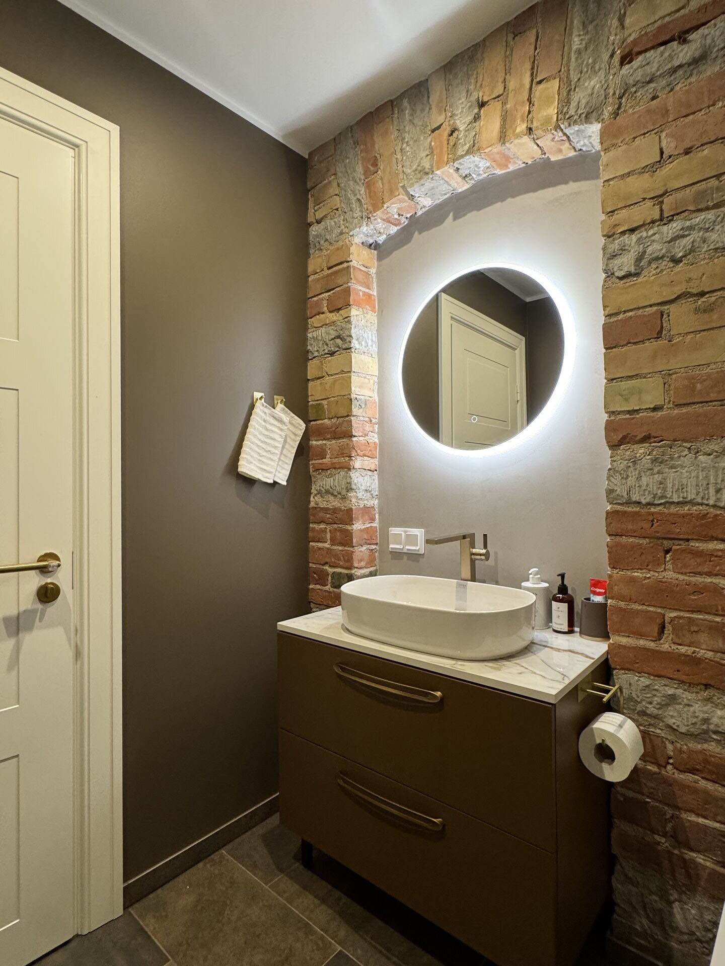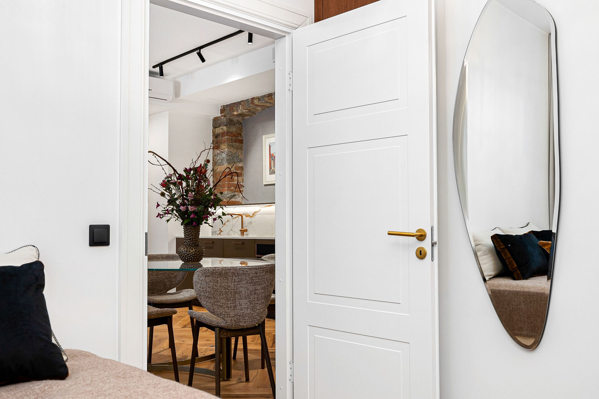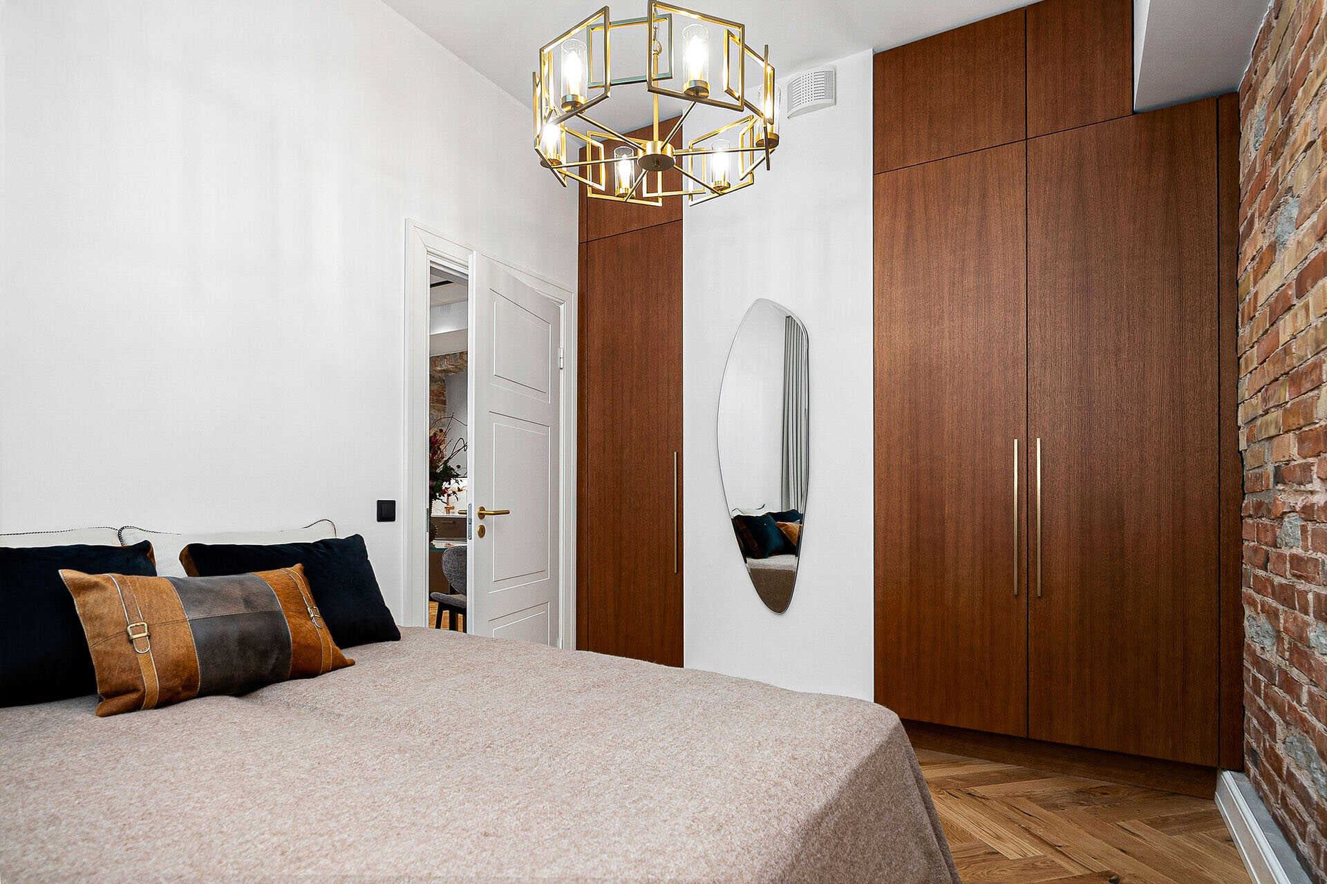 Naturaalsed toonid loovad rahuliku ja hubase atmosfääri, mida täiendavad algupärased punastest tellistest aktsentseinad, lisades ruumile iseloomu ja industriaalset elegantsi.